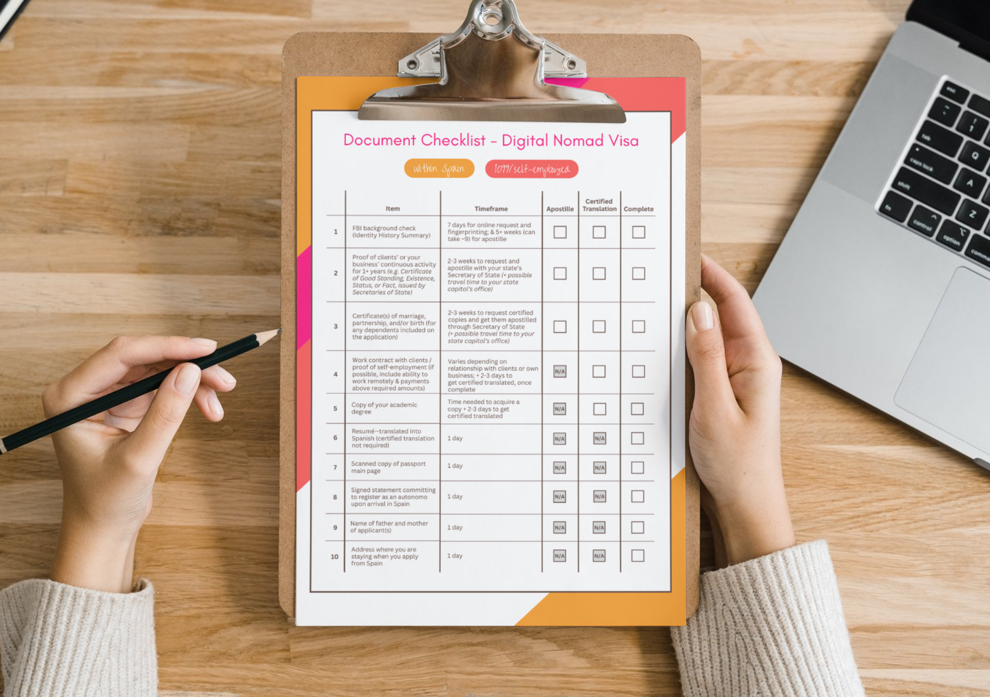 Your purchase also includes detailed downloadable checklists that outline each document’s requirements and expected timeline, customized for each situation of applying for the DNV, whether applying from Spain, the U.S., as self-employed, or employed by an American company.